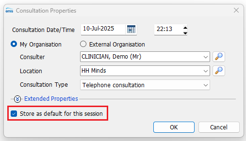 Check the Consultation Properties are correct and check the box 'Store as default for this session':