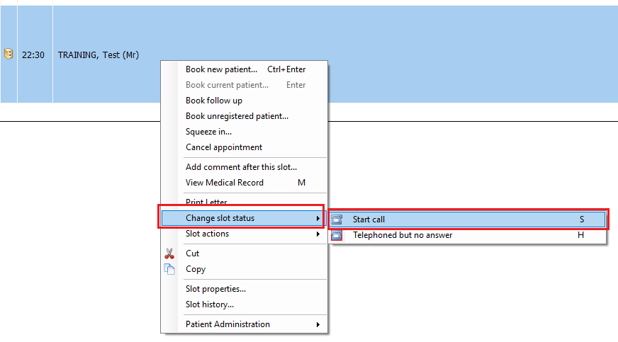 From the Appointment Book, right click on the patient slot and select Change slot status > Start call: