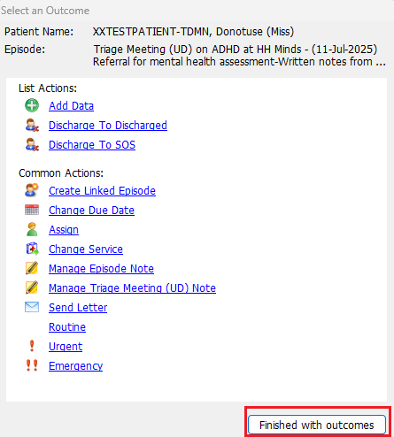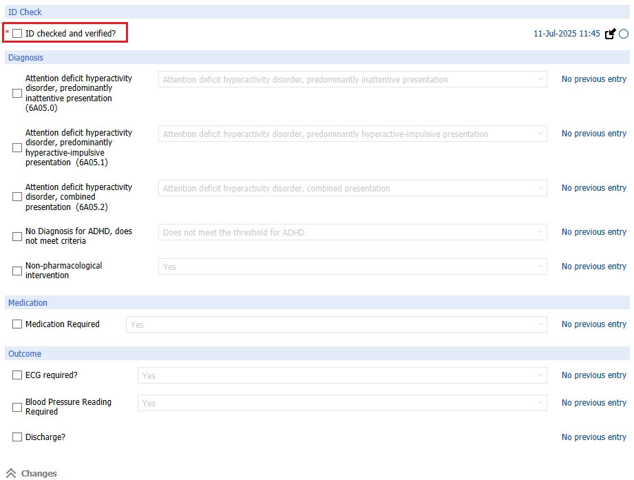 Confirm you checked the patient ID. Complete the Diagnosis, Medication and Outcomes: