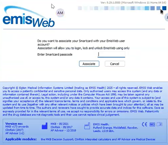 Click on the message and you will be prompted to enter your Smartcard PIN (passcode) and then click on Associate: