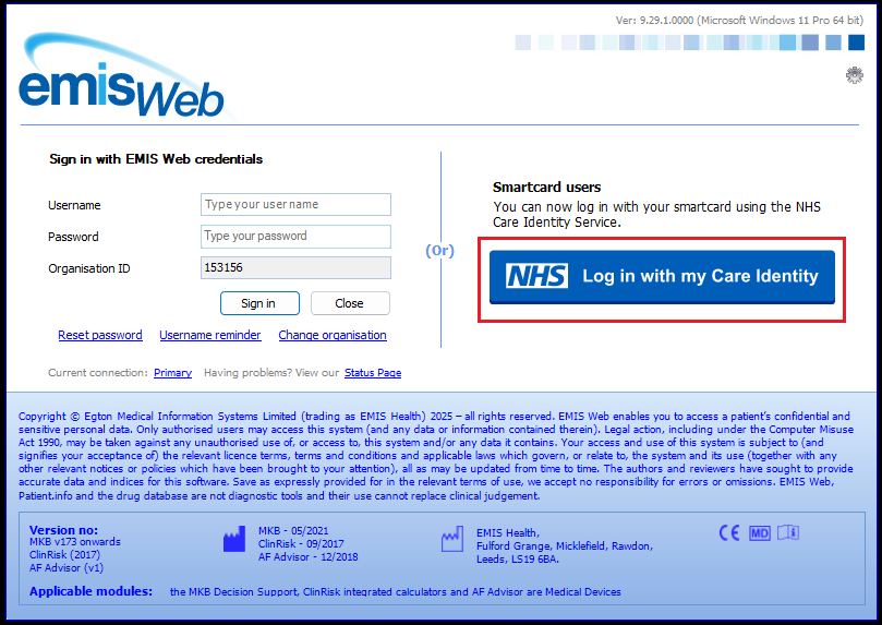 Next time a user logs into EMIS they must inert their Smartcard first and then click on Log in with my Care Identity: