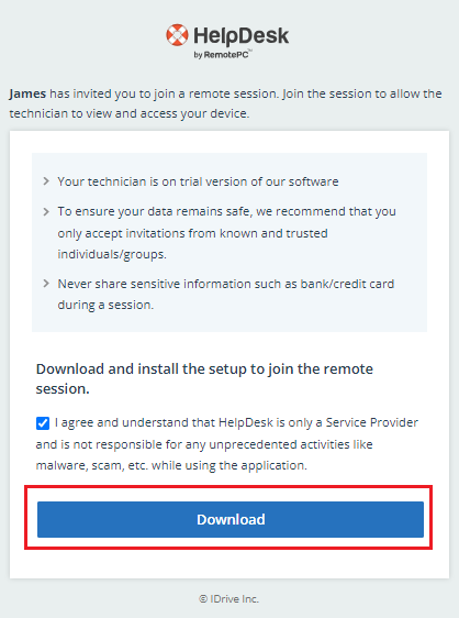 If it is the first time you have been asked to use RemotePC you will be prompted to download the remote session software. Click on Download: