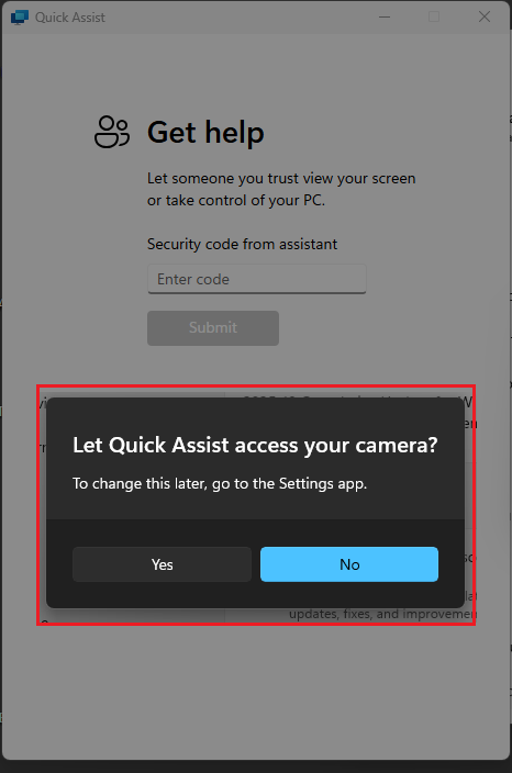 The first time you open Quick Assist you will be asked to Let Quick Assist access your camera - say No:
