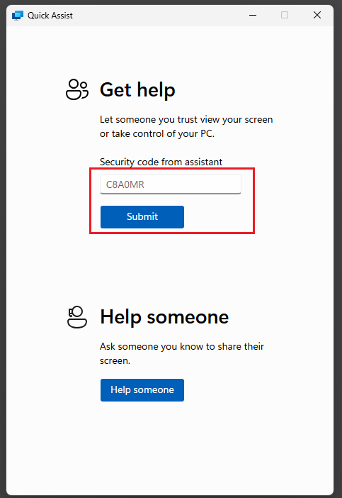 The support engineer will give you a 6 digit alphanumeric code. Enter this in the 'Security code from assistant' box and click on Submit: