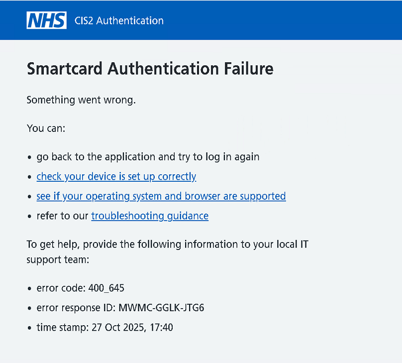 On October 16th 2025, Microsoft released a Windows update that impacted the authentication of NHS Smartcards. This would result in the following error message when trying to authenticate your NHS Smartcard: