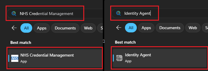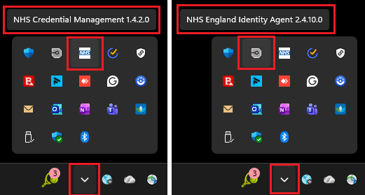 You will also need to make sure you have the latest versions of NHS Credential Management (v1.4.2.0) and NHS England Identity Agent (v 2.4.10.0) on your device. To find out your current versions, click on Show Hidden Icons on your Taskbar and hover over the icons: