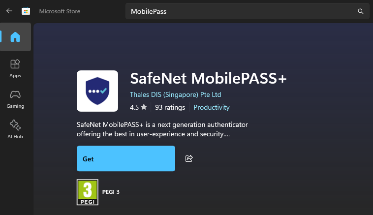 Install SafeNet MobilePass+ on either your mobile phone (from the Apple App Store or the Google Play Store. Alternatively, if you will always be using the same laptop, you can download it from the Microsoft Store and install it on your laptop: