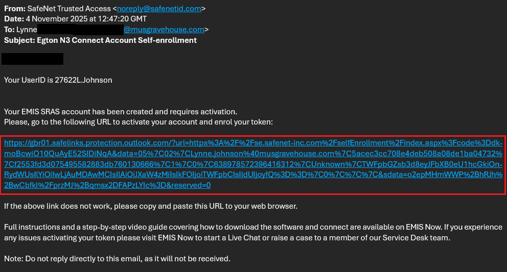 You should have received an email from 'noreply@safenetid.com' like the one below. Click on the blue hyperlink to enroll your Token (if using MobilePass+ on your phone, do this from your phone):