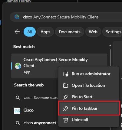 Once installed, do a Windows Search for 'Cisco AnyConnect Secure Mobility Client' and click on the App top open