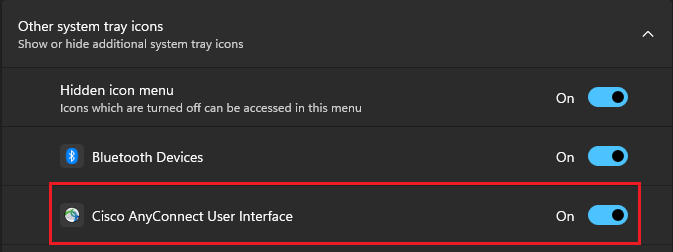 This will then show you when the Cisco AnyConnect Secure Mobility Client has successfully connected in your System Tray (it will have a padlock on the icon)