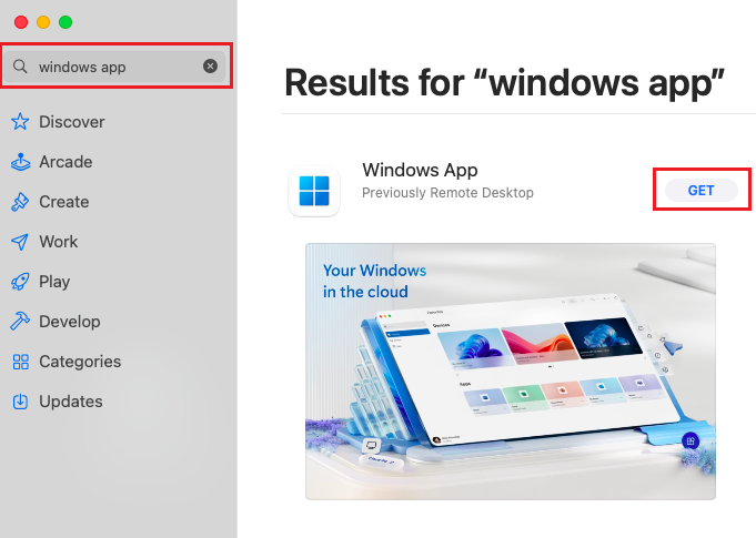 To get started, search for the Windows App from the Microsoft Store or the App Store (for MacBook users) and click on Get to download: