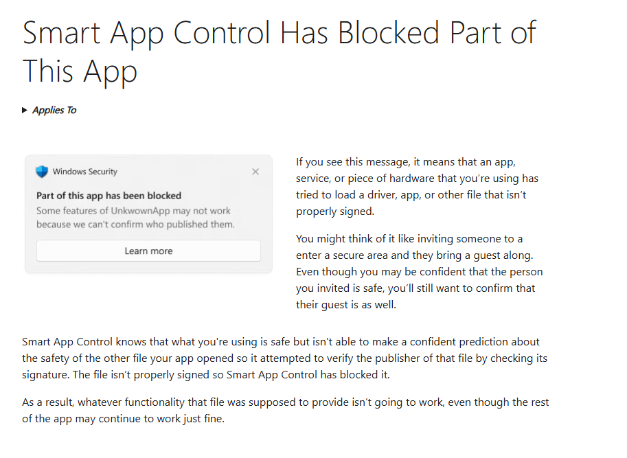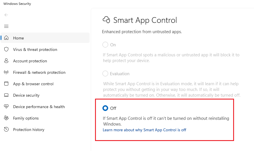 It will be related to the Windows Smart Control App is blocking elements of Windows. To fix this, users will need to turn the Smart App Control off.